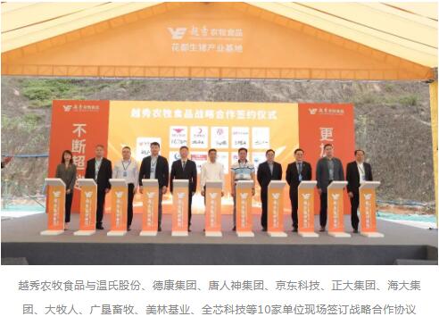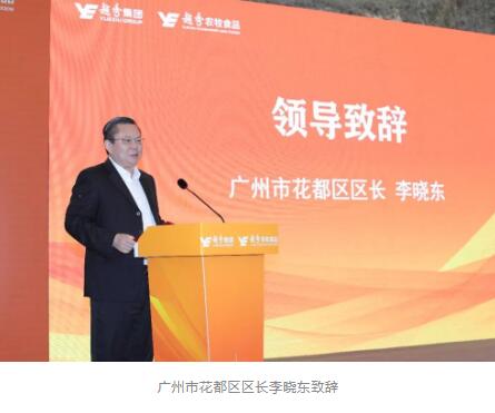 與會領導嘉賓共同參與竣工投產儀式(從左至右依次為:廣州市花都區委副書記程學晉,廣州市貿促會主任 楊勇,廣州市農業農村局局長 李世通,廣州市花都區區長 李曉東,廣州市委副書記 陳向新,廣東省農業農村廳黨組書記 劉棕會,越秀集團黨委書記、董事長張招興,廣州市國資委主任 陳德俊,越秀集團黨委副書記、副董事長、總經理林昭遠,越秀農牧食品董事長 程九洲)
