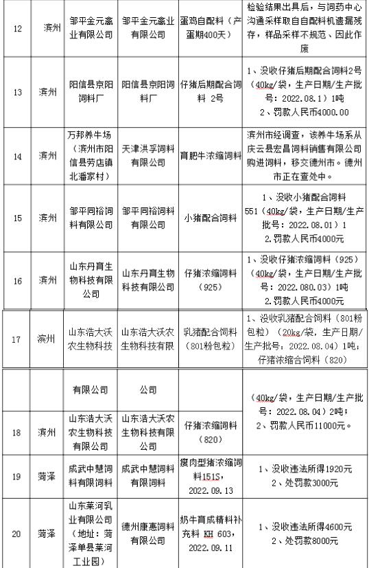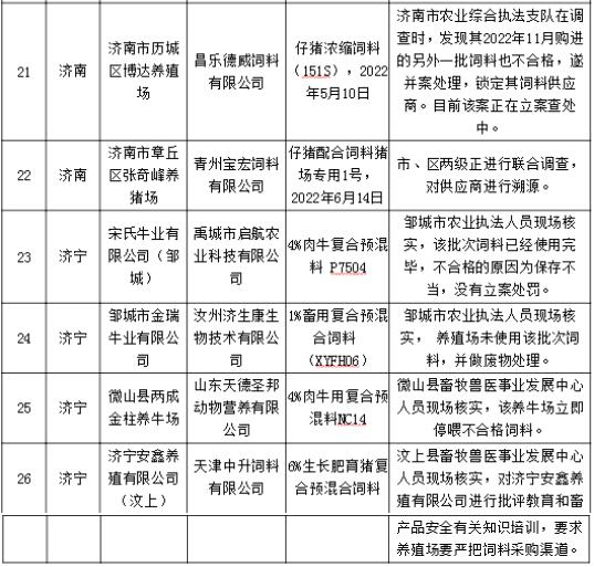 2022年度省級飼料監督抽檢不合格產品查處情況匯總