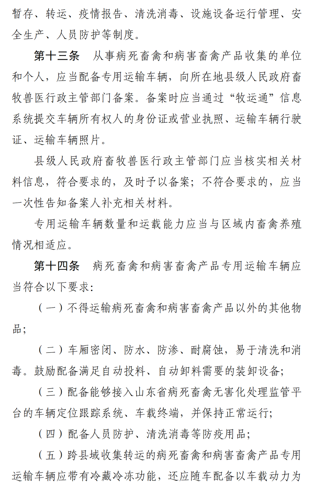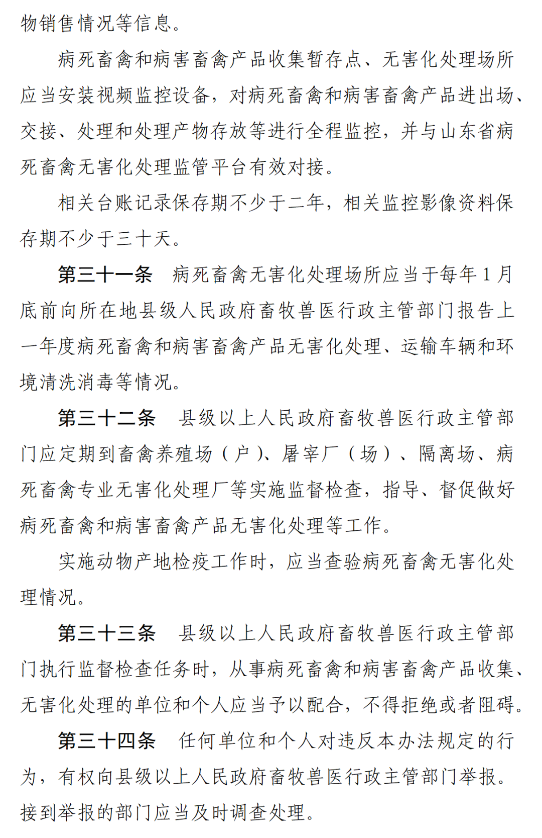 為加強山東省病死畜禽和病害畜禽產品無害化處理管理工作,防控動物疫病,促進畜牧業高質量發展,保障公共衛生安全和人體健康,根據《中華人民共和國動物防疫法》《山東省動物防疫條例》《病死畜禽和病害畜禽產品無害化處理管理辦法》等法律法規規章,山東省畜牧獸醫局制定了《山東省病死畜禽和病害畜禽產品無害化處理管理辦法》,具體內容如下。