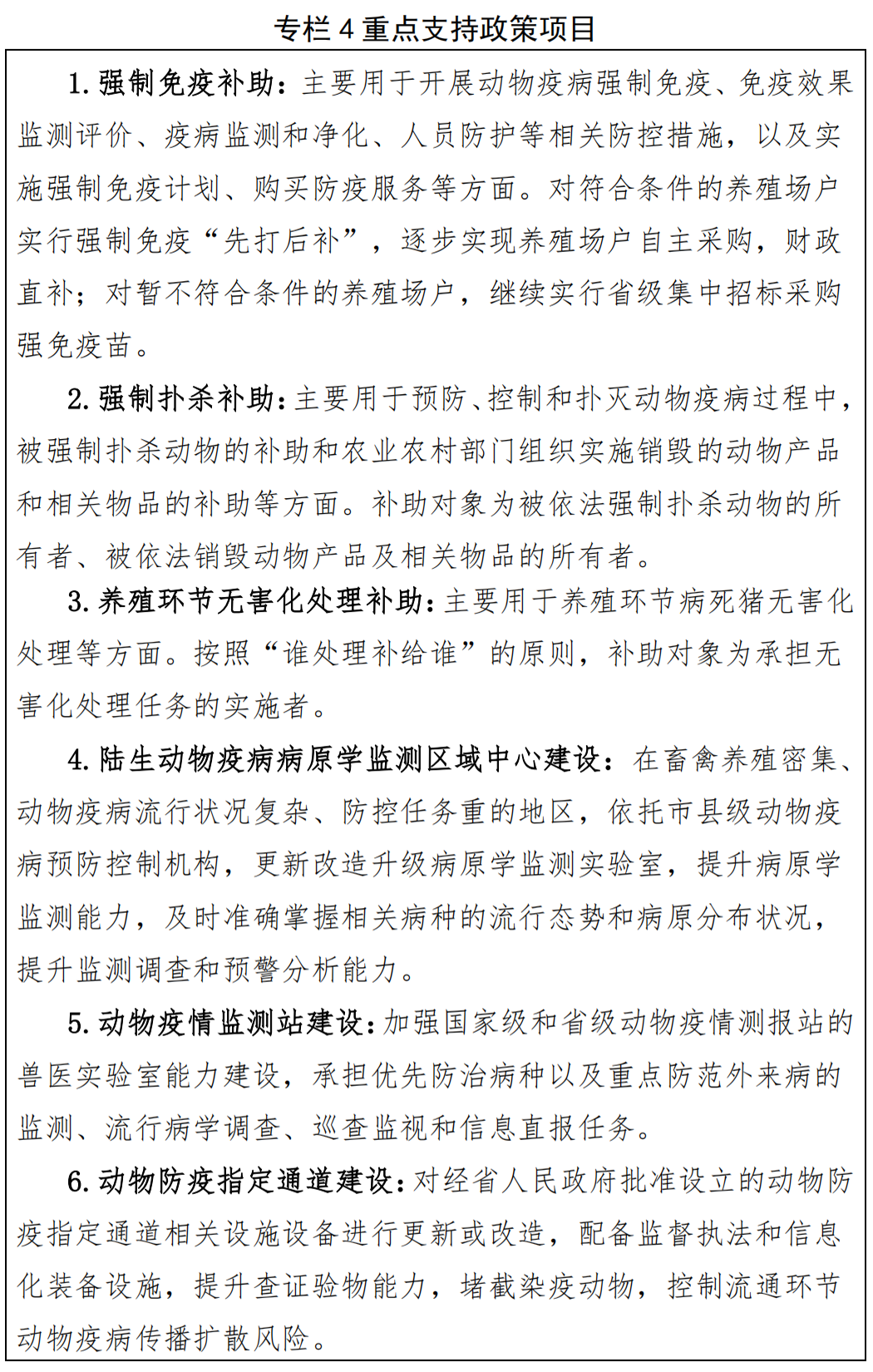 協(xié)調(diào)加大財(cái)政支持力度,全面推進(jìn)免疫、監(jiān)測、流調(diào)、撲殺、凈化、評估、檢疫監(jiān)督、無害化處理、應(yīng)急處置、人員防護(hù)等畜間人獸共患病防治工作(詳見專欄4)。縣級以上地方人民政府要采取措施穩(wěn)定畜間人獸共患病防控隊(duì)伍,將畜間人獸共患病防治經(jīng)費(fèi)納入本級財(cái)政預(yù)算,保障公益性事業(yè)經(jīng)費(fèi)支出,落實(shí)畜牧獸醫(yī)醫(yī)療衛(wèi)生津貼等相關(guān)待遇,確保畜間人獸共患病防治責(zé)有人負(fù)、活有人干、事有人管。