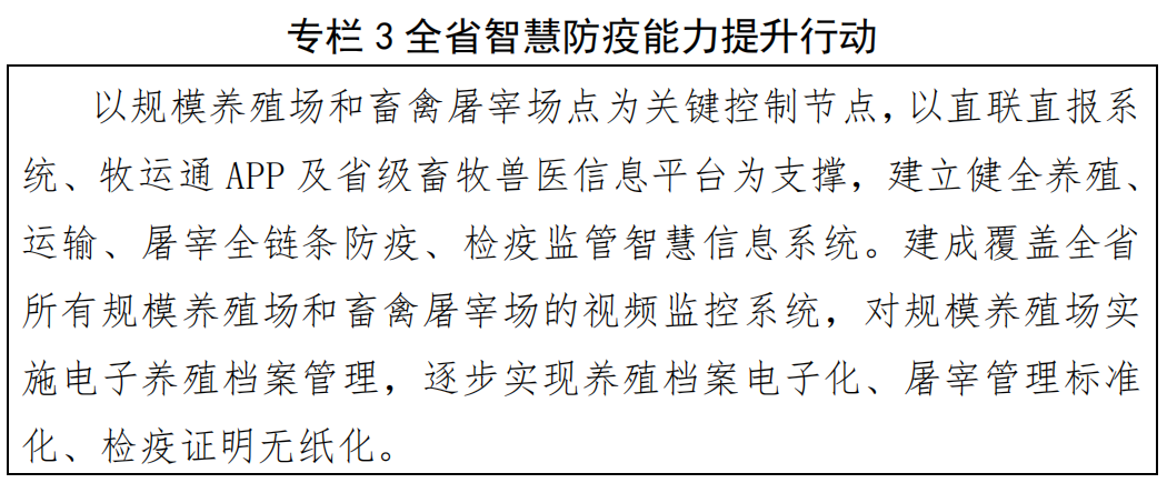 實(shí)施智慧防疫能力提升行動(詳見專欄3),全面提升畜間人獸共患病系統(tǒng)治理能力。運(yùn)用互聯(lián)網(wǎng)、大數(shù)據(jù)、人工智能、區(qū)塊鏈等現(xiàn)代信息技術(shù),織牢織密監(jiān)測預(yù)警網(wǎng)絡(luò)。建立以動物移動監(jiān)管為主線的全鏈條智慧監(jiān)管體系,建成覆蓋養(yǎng)殖場、屠宰企業(yè)、指定通道、無害化處理場、交易市場的智能監(jiān)控信息系統(tǒng),開展動物養(yǎng)殖、運(yùn)輸、交易、屠宰、無害化處理等全鏈條精細(xì)化監(jiān)管,實(shí)現(xiàn)養(yǎng)殖檔案電子化、檢疫證明無紙化、運(yùn)輸監(jiān)管閉環(huán)化。將信息系統(tǒng)配備及與政府監(jiān)管系統(tǒng)對接情況,納入養(yǎng)殖場、屠宰場等標(biāo)準(zhǔn)化示范創(chuàng)建,以及動物疫病凈化場、無疫小區(qū)和無疫區(qū)建設(shè)評估驗(yàn)收內(nèi)容,不斷提高獸醫(yī)衛(wèi)生智慧監(jiān)管能力水平。