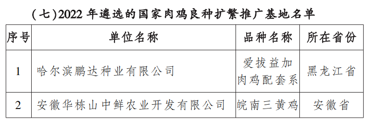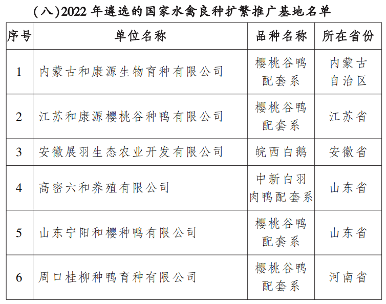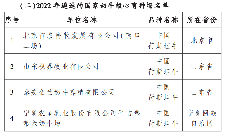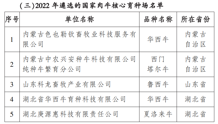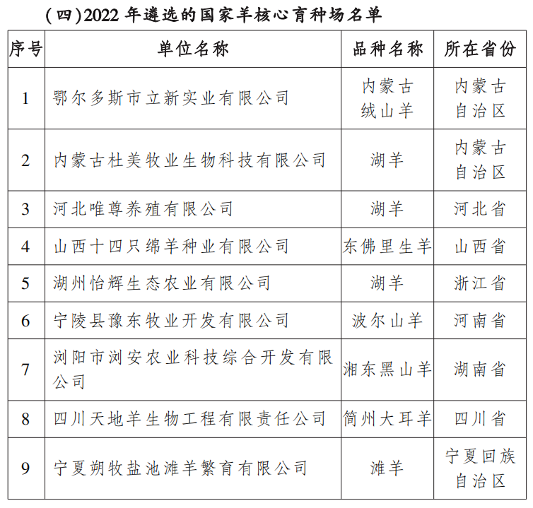農(nóng)業(yè)農(nóng)村部辦公廳關(guān)于公布2022年國家畜禽核心育種場等遴選核驗結(jié)果和信息變更的通知 根據(jù)《全國生豬遺傳改良計劃(2021-2035年)》、《全國奶牛遺傳改良計劃(2021-2035年)》、《全國肉牛遺傳改良計劃(2021-2035年)》、《全國羊遺傳改良計劃(2021-2035年)》、《全國肉雞遺傳改良計劃(2021-2035年)》、《全國水禽遺傳改良計劃(2020-2035年)》及相關(guān)規(guī)定,我部組織全國畜禽遺傳改良計劃領(lǐng)導小組辦公室和專家委員會,開展了2022年國家畜禽核心育種場、良種擴繁推廣基地和核心種公豬站的遴選、核驗和變更審核等工作。現(xiàn)將遴選、核驗和變更結(jié)果通知如下:一、國家畜禽核心育種場、良種擴繁推廣基地、核心種公豬站遴選結(jié)果。廣德市三溪生態(tài)農(nóng)業(yè)有限公司等9家企業(yè)為國家生豬核心育種場,北京首農(nóng)畜牧發(fā)展有限公司(南口二場)等4家企業(yè)為國家奶牛核心育種場,內(nèi)蒙古色也勒欽畜牧業(yè)科技服務有限公司等5家企業(yè)為國家肉牛核心育種場,鄂爾多斯市立新實業(yè)有限公司等9家企業(yè)為國家羊核心育種場,福建圣澤生物科技發(fā)展有限公司等3家企業(yè)為國家肉雞核心育種場,揚州五亭食品集團天歌鵝業(yè)有限公司等3家企業(yè)為國家水禽核心育種場,哈爾濱鵬達種業(yè)有限公司等2家企業(yè)為國家肉雞良種擴繁推廣基地,內(nèi)蒙古和康源生物育種有限公司等6家企業(yè)為國家水禽良種擴繁推廣基地,吉安市傲寶生物科技有限公司等2家企業(yè)為國家核心種公豬站(見附件1)。