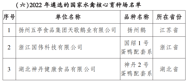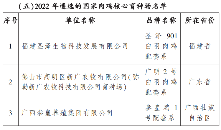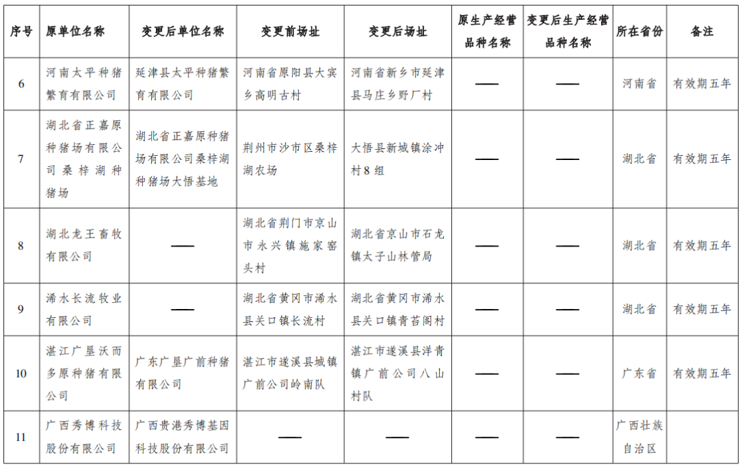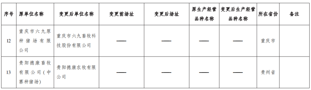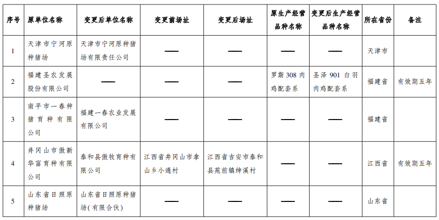 三、國家畜禽核心育種場和良種擴繁推廣基地信息變更情況。按照相關(guān)管理規(guī)定,經(jīng)企業(yè)申請,通過現(xiàn)場核驗,同意福建圣農(nóng)發(fā)展股份有限公司國家級肉雞良種擴繁推廣基地和井岡山市傲新華富育種有限公司等6家國家畜禽核心育種場變更生產(chǎn)經(jīng)營品種或場址,有效期五年;依據(jù)省級農(nóng)業(yè)農(nóng)村部門出具的證明材料,同意天津市寧河原種豬場等6家國家畜禽核心育種場變更單位名稱(見附件4)。