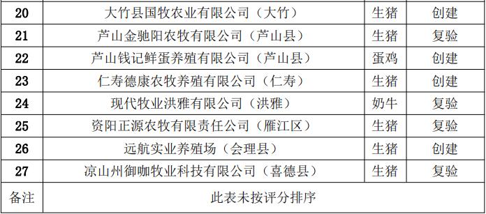 為做好2023年畜禽養(yǎng)殖標準化示范創(chuàng)建工作,按照《四川省農(nóng)業(yè)農(nóng)村廳關(guān)于印發(fā)〈2023年畜禽養(yǎng)殖標準化示范創(chuàng)建活動實施方案〉的通知》(川農(nóng)函〔2023〕76號)要求,各市(州)組織開展了畜禽養(yǎng)殖標準化示范創(chuàng)建活動。經(jīng)養(yǎng)殖場自愿申請、縣級申報、市(州)推薦、省廳組織專家進行材料審查和現(xiàn)場考核驗收復驗等程序,遴選出了四川牧原有限公司(金堂)等27家2023年畜禽養(yǎng)殖標準化示范場名單,其中四川省康寧農(nóng)業(yè)有限公司等11家為復驗畜禽養(yǎng)殖標準化示范場,擬向農(nóng)業(yè)農(nóng)村部推薦,現(xiàn)予以公示。