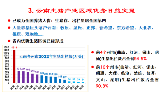 其三,云南生豬產業區域優勢日益凸顯。云南生豬存欄、出欄量居全國第四,牧原、溫氏、正邦、新希望、東方希望、大北農、德康、雙胞胎等大量養豬巨頭落戶云南,且省內優勢生豬區域已經形成。數據顯示,曲靖、紅河、保山、昭通四大州市生豬出欄量占全省54.5%,加上大理、臨滄、楚雄、普洱、文山、昆明合計十大州市全年出欄量占云南省的90.3%。