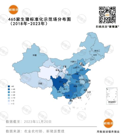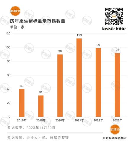 截至2023年,有效期內(nèi)生豬示范場(chǎng)累計(jì)總數(shù)已達(dá)到465家。按照生豬能繁母豬存欄600頭以上,且年出欄育肥豬10000頭以上的遴選標(biāo)準(zhǔn),以最低標(biāo)準(zhǔn)估算,465家示范場(chǎng)覆蓋超過能繁母豬27.9萬頭,大約占全國(guó)能繁母豬0.70%。