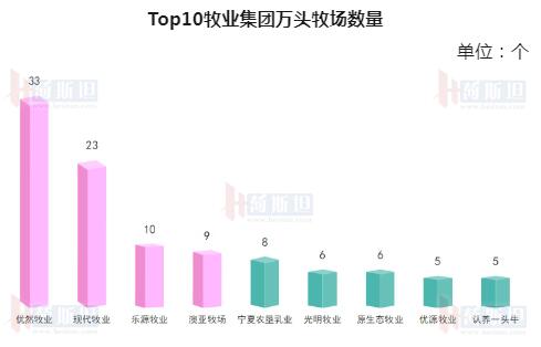 萬頭牧場的建設(shè)主體為牧業(yè)集團,Top10萬頭牧場牧業(yè)集團擁有萬頭牧場109座,占全國萬頭牧場總量66%。優(yōu)然牧業(yè)是全國萬頭牧場數(shù)量最多的牧業(yè)集團,現(xiàn)代牧業(yè)位居第二。