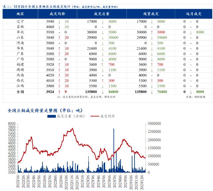 3、豆粕價(jià)格維持3926元/噸2023年,豆粕行情風(fēng)光不再,行情一波三折,整體振蕩下跌,最低價(jià)跌破3800元大關(guān),最高價(jià)也不到5100,與2022年豆粕的最高價(jià)5660元/噸,相差500多元。2024年,豆粕又將何去何從,能否擺脫頹勢(shì),再創(chuàng)高峰?