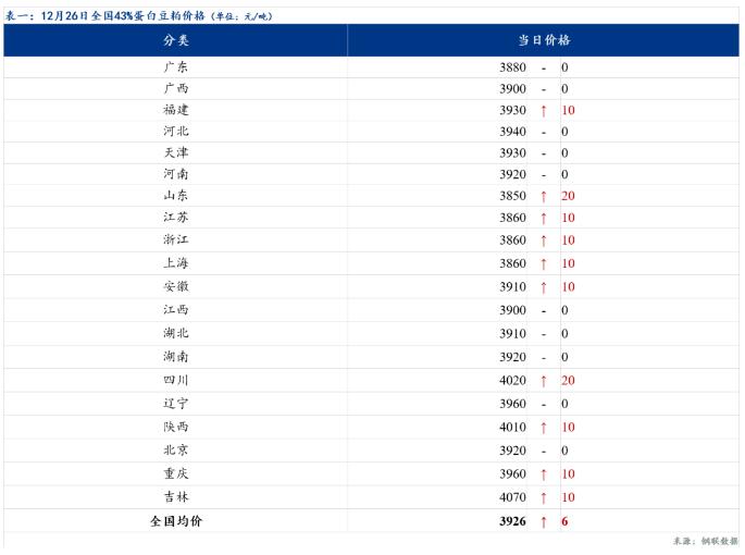 12月26日油廠(chǎng)豆粕報(bào)價(jià)穩(wěn)中上調(diào),其中沿海區(qū)域油廠(chǎng)主流報(bào)價(jià)在3850-3930元/噸,廣東3880元/噸穩(wěn)定,江蘇3860漲10元/噸,山東3850漲20元/噸,天津3930元/噸穩(wěn)定。