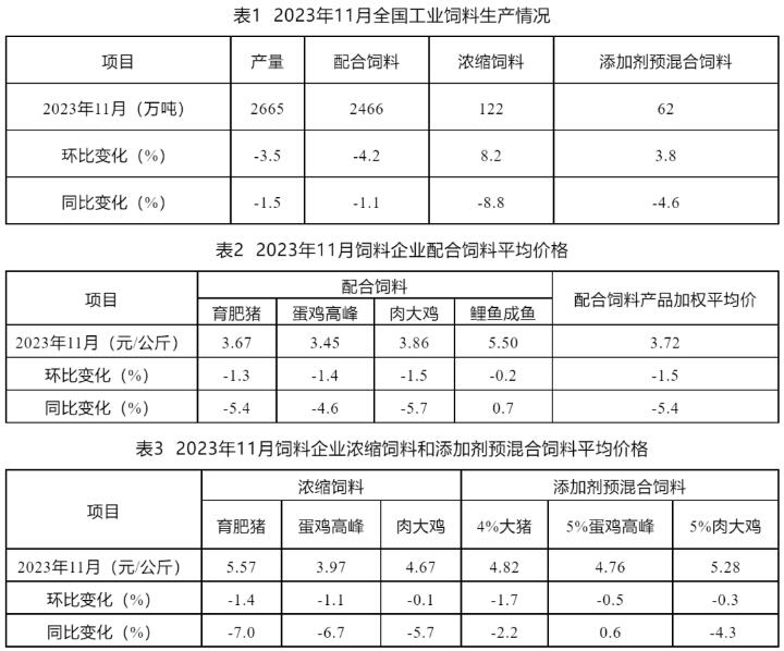 據樣本企業數據測算,2023年11月,全國工業飼料產量2665萬噸,環比下降3.5%,同比下降1.5%。主要配合飼料、濃縮飼料、添加劑預混合飼料產品出廠價格環比、同比均呈下降趨勢。飼料企業生產的配合飼料中,玉米用量占比為31.3%,配合飼料和濃縮飼料中,豆粕用量占比為12.2%,同比分別下降5.0和1.9個百分點。