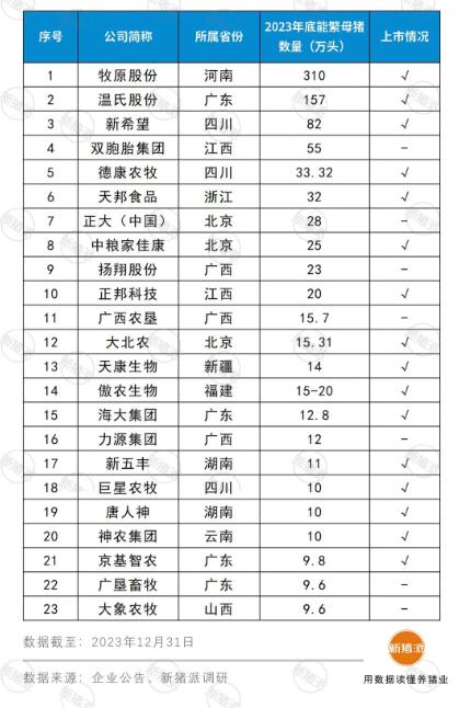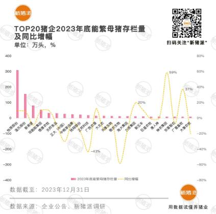 變局之下,迫于資金、非瘟壓力等影響,縮減母豬規模的養豬巨頭占據了多數。據新豬派統計,截至2023年底,我國TOP20豬企能繁母豬共計918萬頭,較2022年底下降1%,占全國總量的22%,其中13家企業紛紛下調母豬規模。能繁母豬超過10萬頭的企業仍保持在23家。