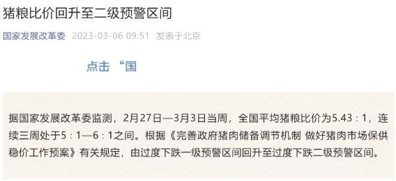發改委:豬糧比價回升至過度下跌二級預警區間 來源: 互聯網 2023-03-12 20:32:14 閱讀() 發改委3月6日消息,據國家發展改革委監測,2月27日—3月3日當周,全國平均豬糧比價為5.43∶1,連續三周處于5∶1—6∶1之間。根據《完善政府豬肉儲備調節機制 做好豬肉市場保供穩價工作預案》有關規定,由過度下跌一級預警區間回升至過度下跌二級預警區間。