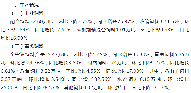 飼料生產(chǎn)情況根據(jù)對全省飼料生產(chǎn)企業(yè)上報數(shù)據(jù)分析,4月份,全省工業(yè)飼料總產(chǎn)量和總產(chǎn)值均呈現(xiàn)環(huán)比下降,同比增長態(tài)勢。全省工業(yè)飼料總產(chǎn)量(不含寵物飼料)37.35萬噸,環(huán)比下降...