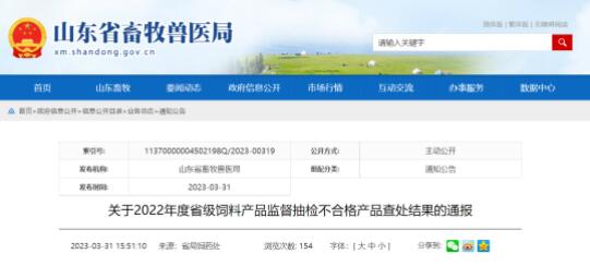 近日,山東省畜牧獸醫局發布《關于2022年度省級飼料產品監督抽檢不合格產品查處結果的通報》。《通報》表示,2022年山東省級飼料產品質量安全監督抽查共完成1144批次(其中含風...