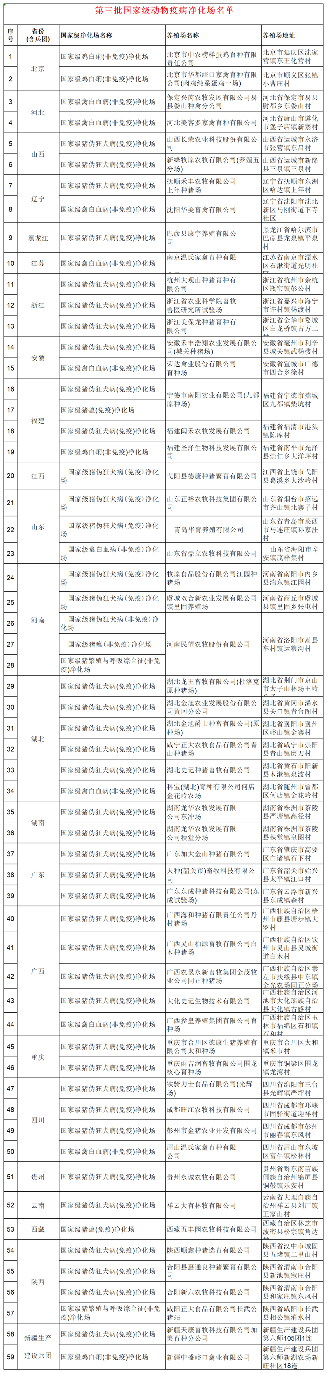現確定全國31個省份的119個養殖場為第三批國家級動物疫病凈化場。其中牧原、峪口、禾豐、溫氏、華美、正大、科寶、榮達禽業、圣農等59家生豬、家禽國家級凈化場名上...