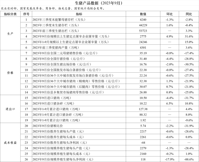 農業農村部:2023年9月生豬產品數據