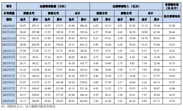 公司2023年9月份銷售商品豬48.67萬頭(其中仔豬銷售57,421頭),銷售收入83,500.86萬元,銷售均價16.38元/公斤(商品肥豬均價為16.45元/公...