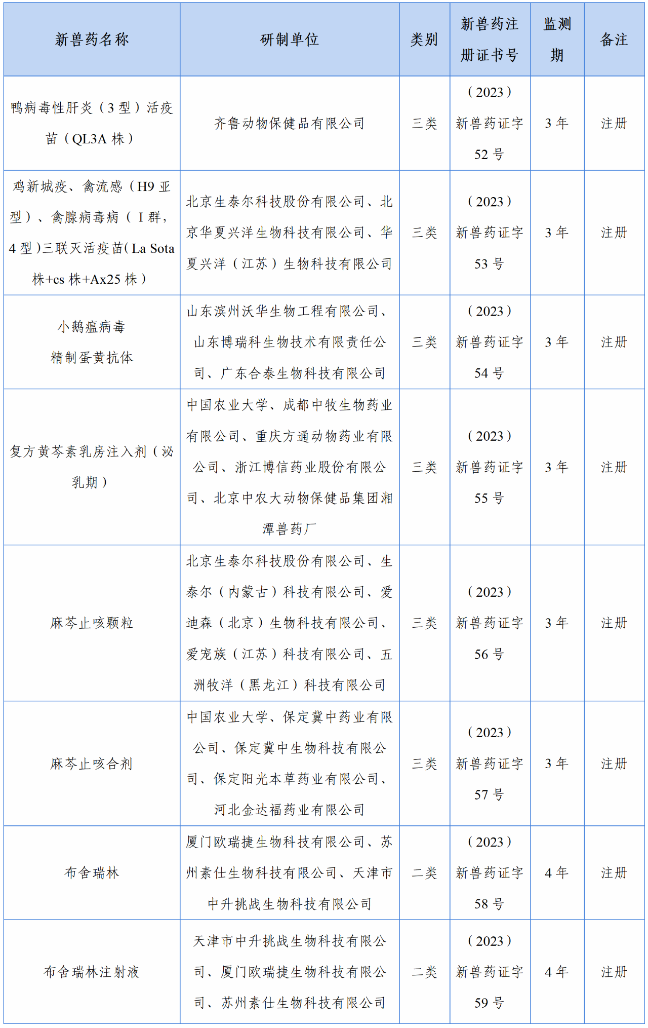 根據《獸藥管理條例》和《獸藥注冊辦法》規定,經審查,批準齊魯動物保健品有限公司等23家單位申報的鴨病毒性肝炎(3型)活疫苗(QL3A株)等8種獸藥產品...