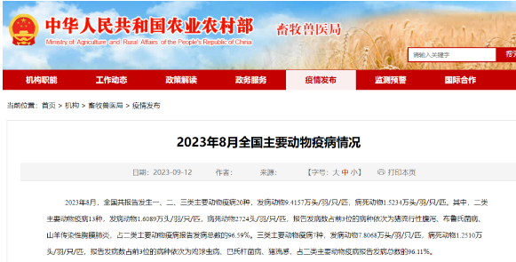 據農業農村部公布的2023年8月全國主要動物疫病情況顯示,2023年8月,全國豬病方面,一類中非洲豬瘟是0發病0死亡;二類中腹瀉發病數和死亡數最高,藍耳病次之;三類中豬丹毒和豬流感的發...