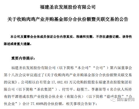 圣農發展今天發布公告,公司擬以自有資金1.75億元收購控股股東福建圣農控股集團有限公司(以下簡稱“圣農集團”)、付雪平、趙筱蘭、李惠陽等4名合伙人所持有的平潭德成農牧產...