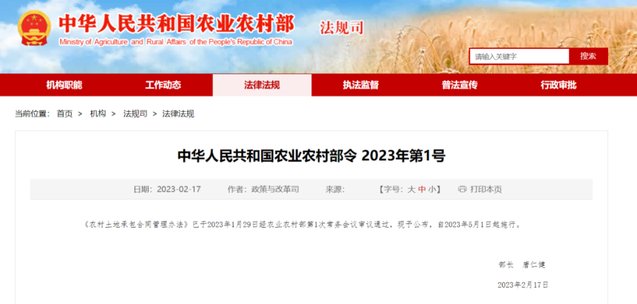 近日,農(nóng)業(yè)農(nóng)村部公布《農(nóng)村土地承包合同管理辦法》。據(jù)了解,該《辦法》于2023年1月29日經(jīng)農(nóng)業(yè)農(nóng)村部第1次常務(wù)會(huì)議審議通過,自2023年5月1日起施行。