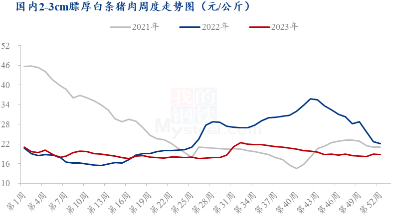 據Mysteel農產品數據顯示,2023年前三等級白條均價在19.16元/公斤;同比下跌23.39%。12月29日價格為18.45元/公斤,較1月1日價格下跌2.83元/公斤,跌幅在12.72%;其中,年中最高價在8月2月,價格為22.78元/公斤;最低價在4月17日,價格為17.43元/公斤。