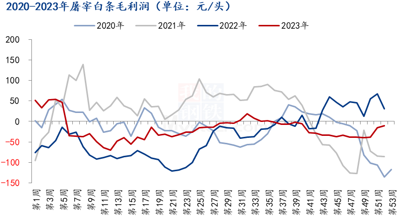 2023年,全國屠宰白條毛利潤平均虧損17.82元/頭;最高盈利在第四周,周均盈利53.56元/頭;最低在第12周,周均虧損在70.36元/頭。年初,受春節備貨支撐,白條銷售較好,屠宰毛利潤開始逐漸盈利。但春節過后,終端消費開始低迷,難以支撐白條價格繼續上漲,屠宰企業開始進入虧損;加之上半年豬價受多方利空因素影響,價格震蕩下行,白條價格跟跌走弱,屠宰企業虧損加重;后期隨著屠企縮量保價,屠宰白條毛利潤虧損縮減,但仍未出現盈利。