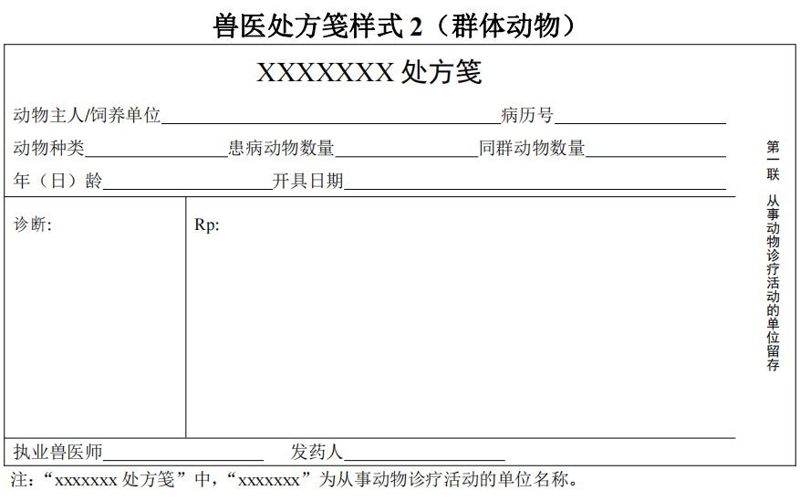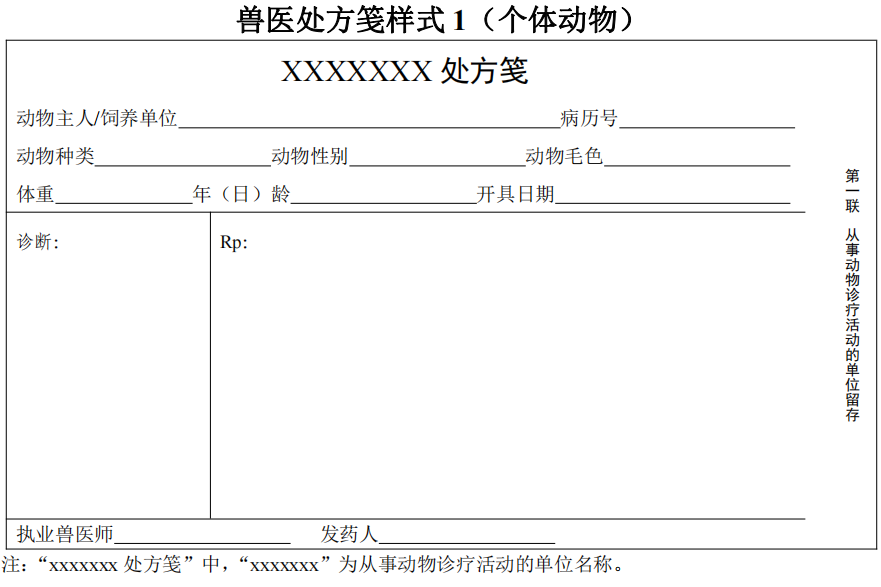獸醫(yī)處方箋規(guī)格和樣式(見附錄3)由農(nóng)業(yè)農(nóng)村部規(guī)定,從事動(dòng)物診療活動(dòng)的單位應(yīng)當(dāng)按照規(guī)定的規(guī)格和樣式印制獸醫(yī)處方箋或者設(shè)計(jì)電子處方箋。獸醫(yī)處方箋規(guī)格如下: