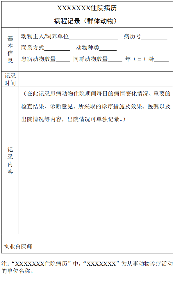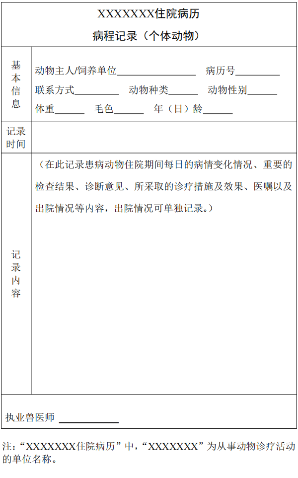 3. 入院記錄完成后,由執(zhí)業(yè)獸醫(yī)師對動(dòng)物病情和診療過程進(jìn)行連續(xù)性病程記錄并簽名(蓋章)確認(rèn)。病程記錄包括患病動(dòng)物住院期間每日的病情變化情況、重要的檢查結(jié)果、診斷意見、所采取的診療措施及效果、醫(yī)囑以及出院情況等內(nèi)容。
