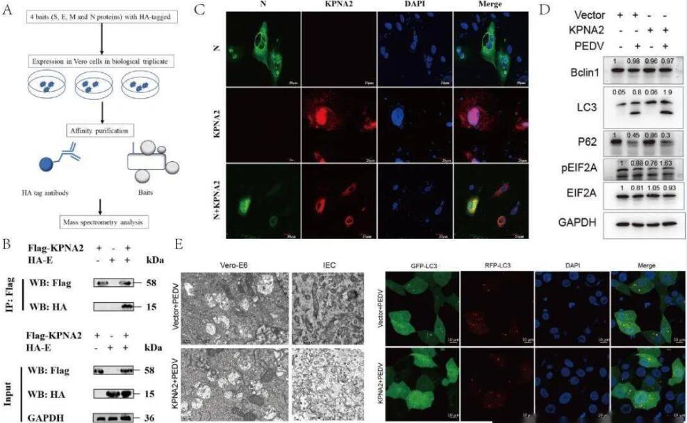 PEDV的結構蛋白在病毒入侵、釋放、復制、組裝、出芽和宿主免疫調節中起著關鍵作用,與其它病毒相似,PEDV主要依賴于宿主細胞進行復制。該研究在繪制PEDV結構蛋白與宿主因子相互作用的圖譜時發現KPNA2具有抑制PEDV復制的作用。通過質譜技術篩選到與病毒E蛋白互作的宿主蛋白KPNA2,檢測到PEDV感染的細胞中KPNA2表達上調(圖A和B)。同時,發現KPNA2在PEDV感染后出核至胞質(圖C),與E蛋白結合,通過自噬降解E蛋白實現對病毒復制的抑制(圖D和E)。